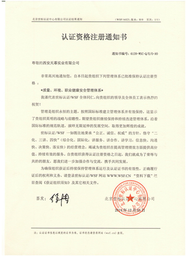 而就在这天,我公司收到北京世标认证中心寄来的快件,宛如阳光,温暖着天幕人。而快件的内容更像是古时候军队传来的捷报,振奋人心——我公司成功取得“质量、环境、职业健康安全管理体系”认证注册资格。