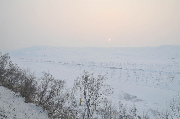 戈壁,在沧海桑田中透着时代的变迁,这里曾经盛极一时,人们前来欣赏或是凭吊远去的盛世。可是,眼下的苍茫大地似乎是那么贫穷,穷得让人心酸。站在戈壁的深处,远望荒芜,心中滑过一丝悲凉。但当我们再回头看时,忽然发觉,那个真正成熟收获的季节离我已经越来越近了。层层积雪的覆盖下,我们的高楼正在崛起,我们的辉煌即将铸就。顽强的天幕人用无尽的努力在这茫茫戈壁上竖起了信念的丰碑。